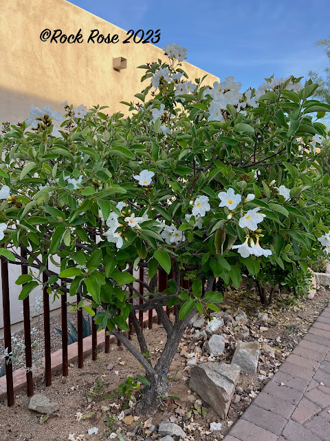 It is only now that most of them are free from last years leaves. I find myself going out ever morning and helping them along. The litter isn't all bad because it dries out very quickly and I go around and crunch it up and leave as mulch. The fruit are another thing. They attract the javelina so I find myself collecting them up or cutting them off before they fall. It is a prolific fruiter and every flower seems to produce a fruit.